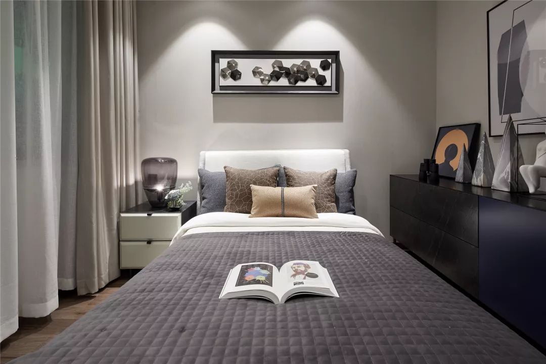 次卧的面积会更小一些,只在床头的一个摆放了床头柜,另一侧做个斗柜搭配装饰画和装饰品来点缀,整体让人感觉很时尚。