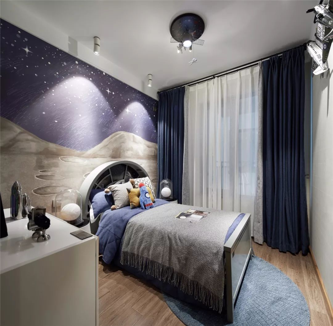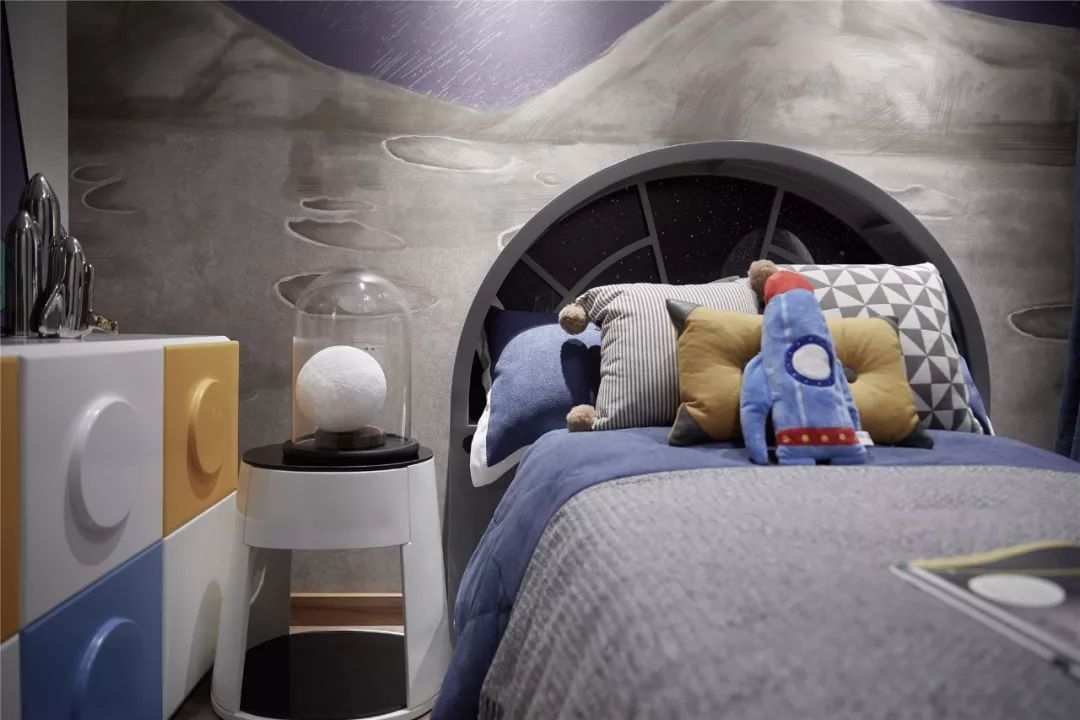 儿童房的整体的设计让人感觉很有科幻感,主体是以太空为主,床、床头背景墙都选择了相关的元素,也可以培养孩子的爱好。
