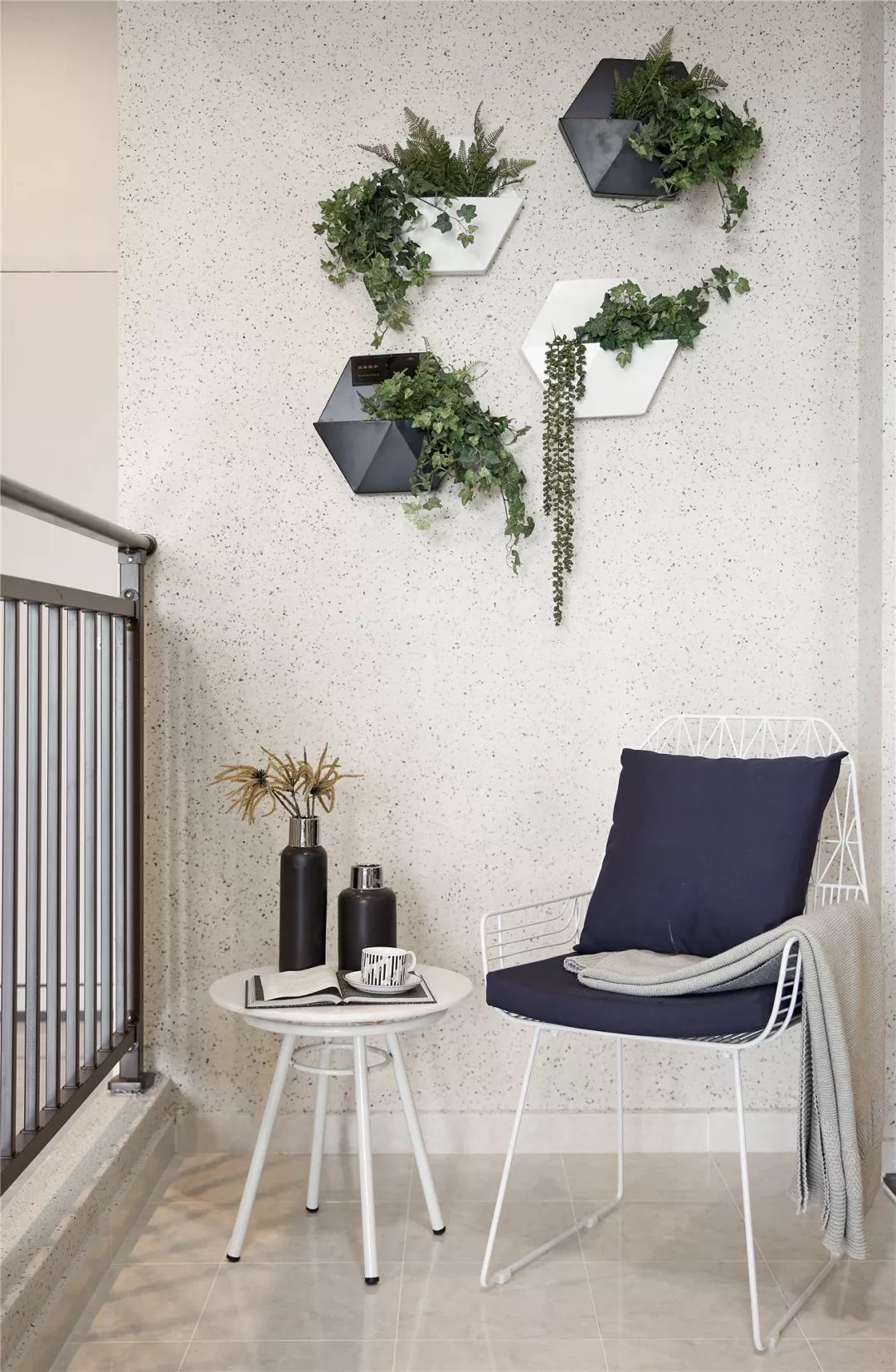 阳台的一侧被屋主改成了一个迷你的休闲区,地面摆放桌椅,墙面用四个创意的置物架来摆放绿植,清新而又悠闲。