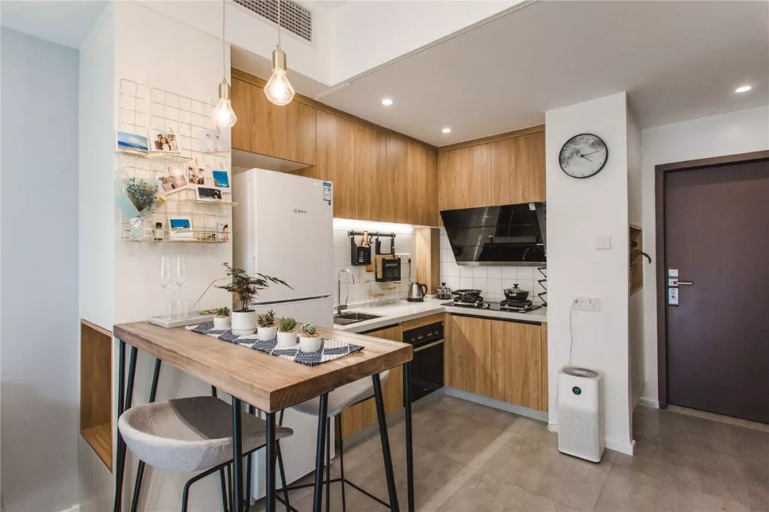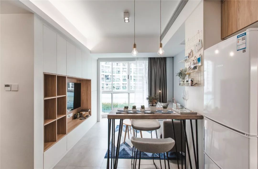 餐厅是由一个迷你的吧台构成的,也把厨房和客厅给分开了,吧台侧方的墙面还做了铁丝照片墙的设计,让人感觉更加有情调。