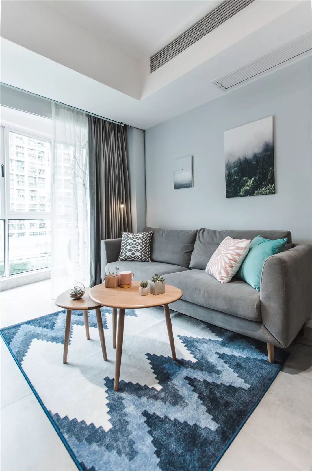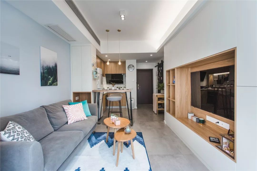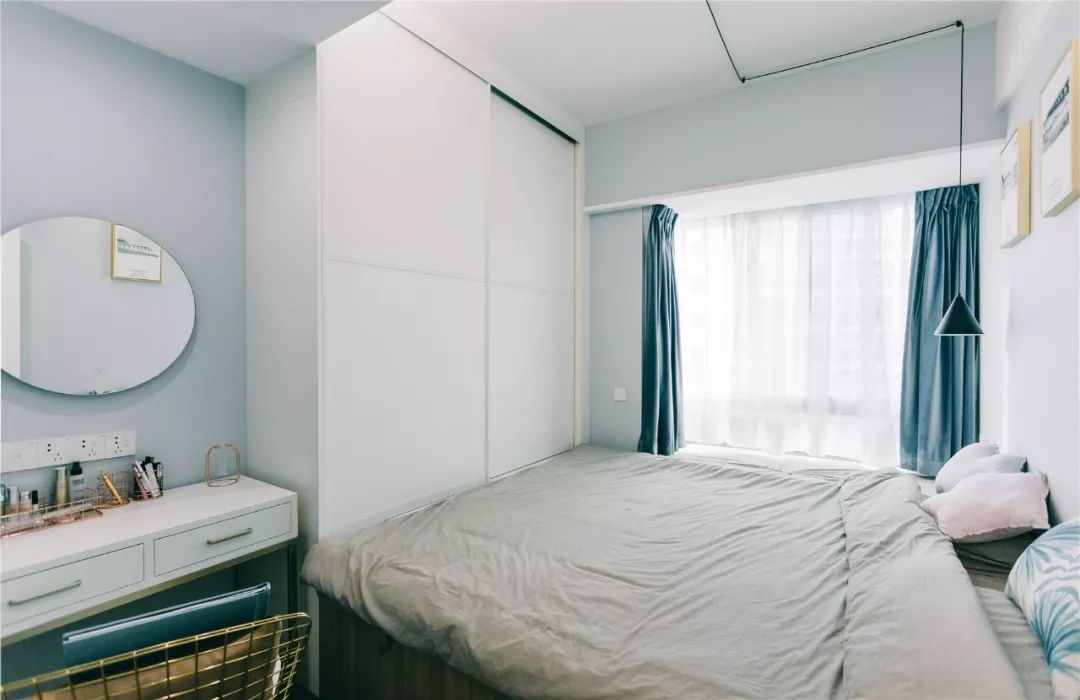 客厅和阳台之间只是用窗帘来分开,在窗帘上还做了隐藏的投影幕布。客厅的沙发背景墙刷成了浅蓝色,搭配简洁的装饰画看起来非常清新文艺。