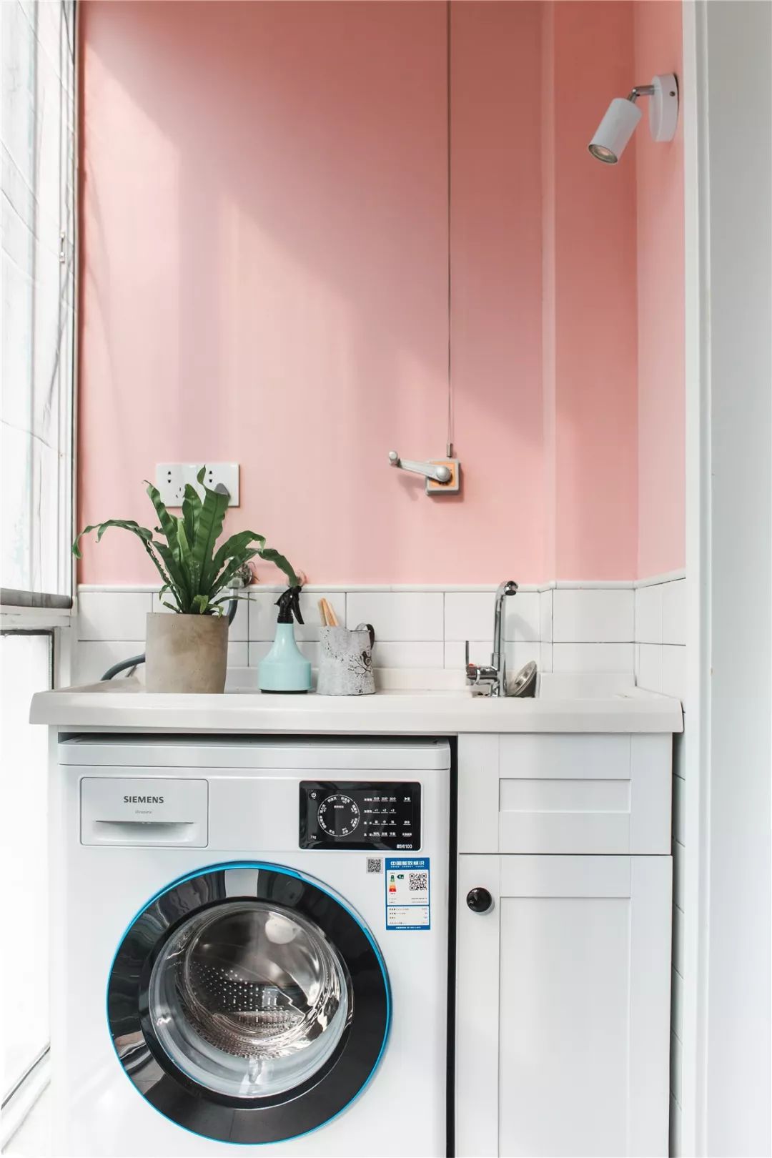 客厅外的阳台一侧是做了洗衣机和洗手台的组合式设计,上方的墙面刷成了粉色,让阳台空间变得更加的优雅、有趣。