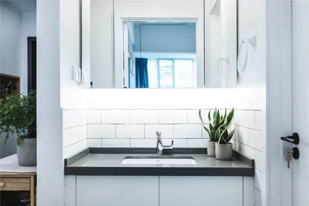 卫生间被设计成了彻底干湿分离的设计,洗手台外移在了卫生间的门外,镜柜结合浴室柜也能够满足收纳的需求。