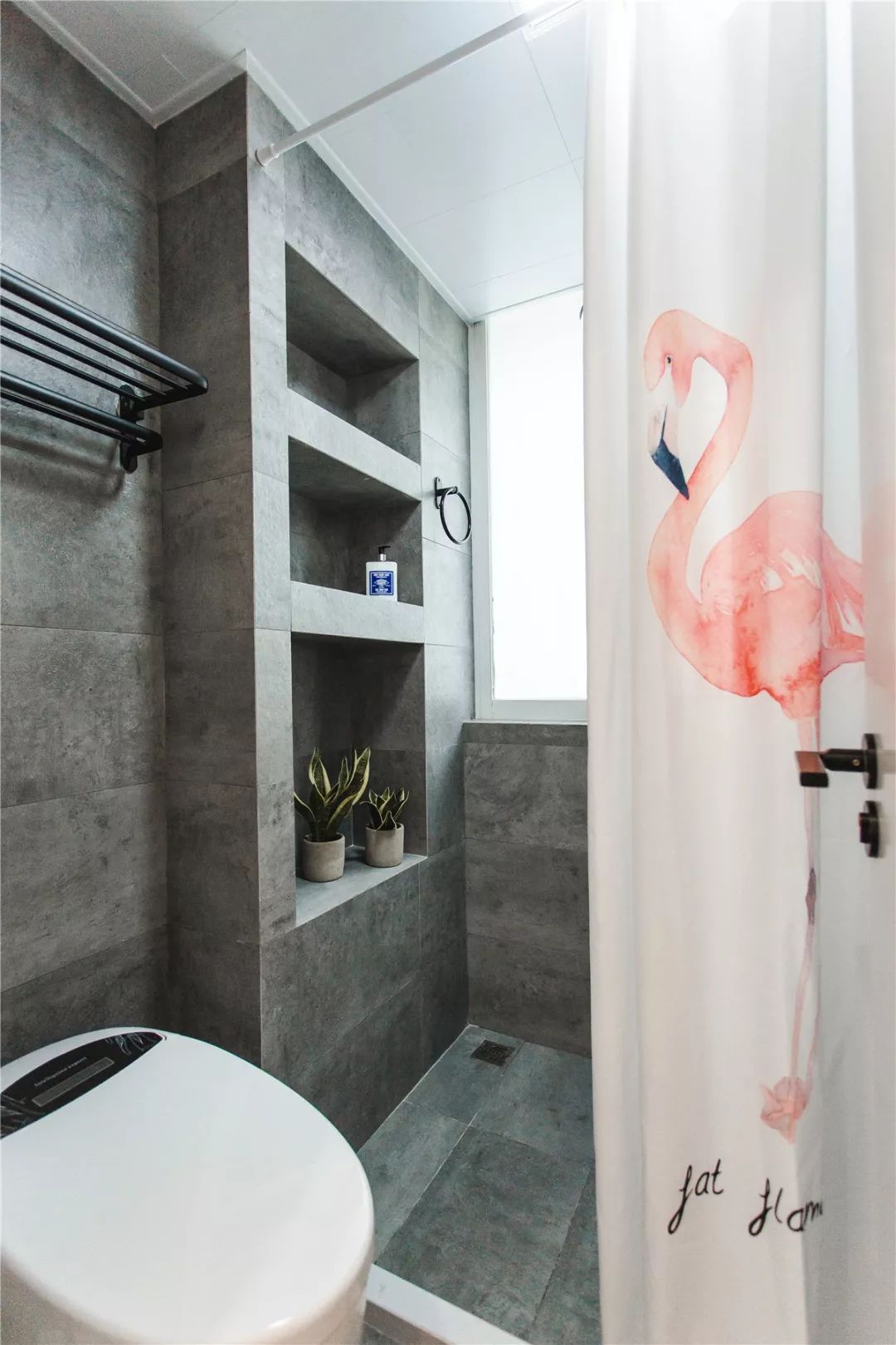 卫生间内部也把淋浴区和马桶给分开了,浴帘和挡水条更加简便。在淋浴区内做上壁龛来辅助收纳,水泥质感的墙地砖显得非常别致。