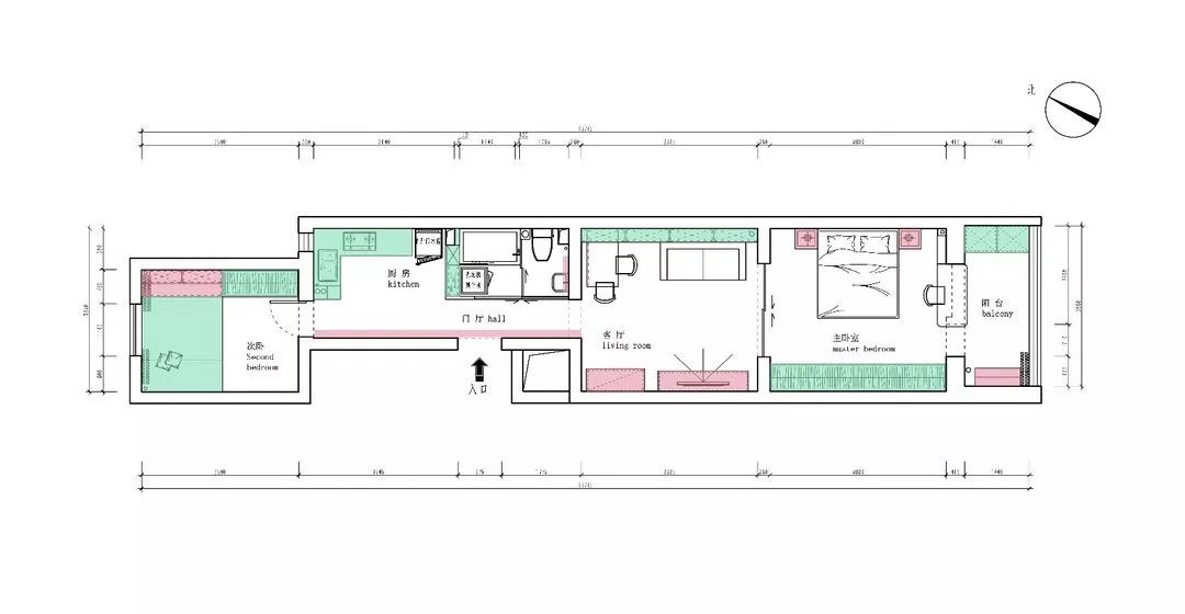 关注微信公众号:jiaxhx,学习更多小户型装修知识技巧齐家小菜今天分享的是一套建筑面积65平米的简约风小户型二居室案例,房子的格局是长条形的,两间卧室位于南北两侧,中间是厨房、玄关走廊、卫生间和客餐厅空间,虽然房子的采光不好,但整体的设计却非常的明亮和温馨,让人羡慕不已。平面布置图入户的玄关走廊