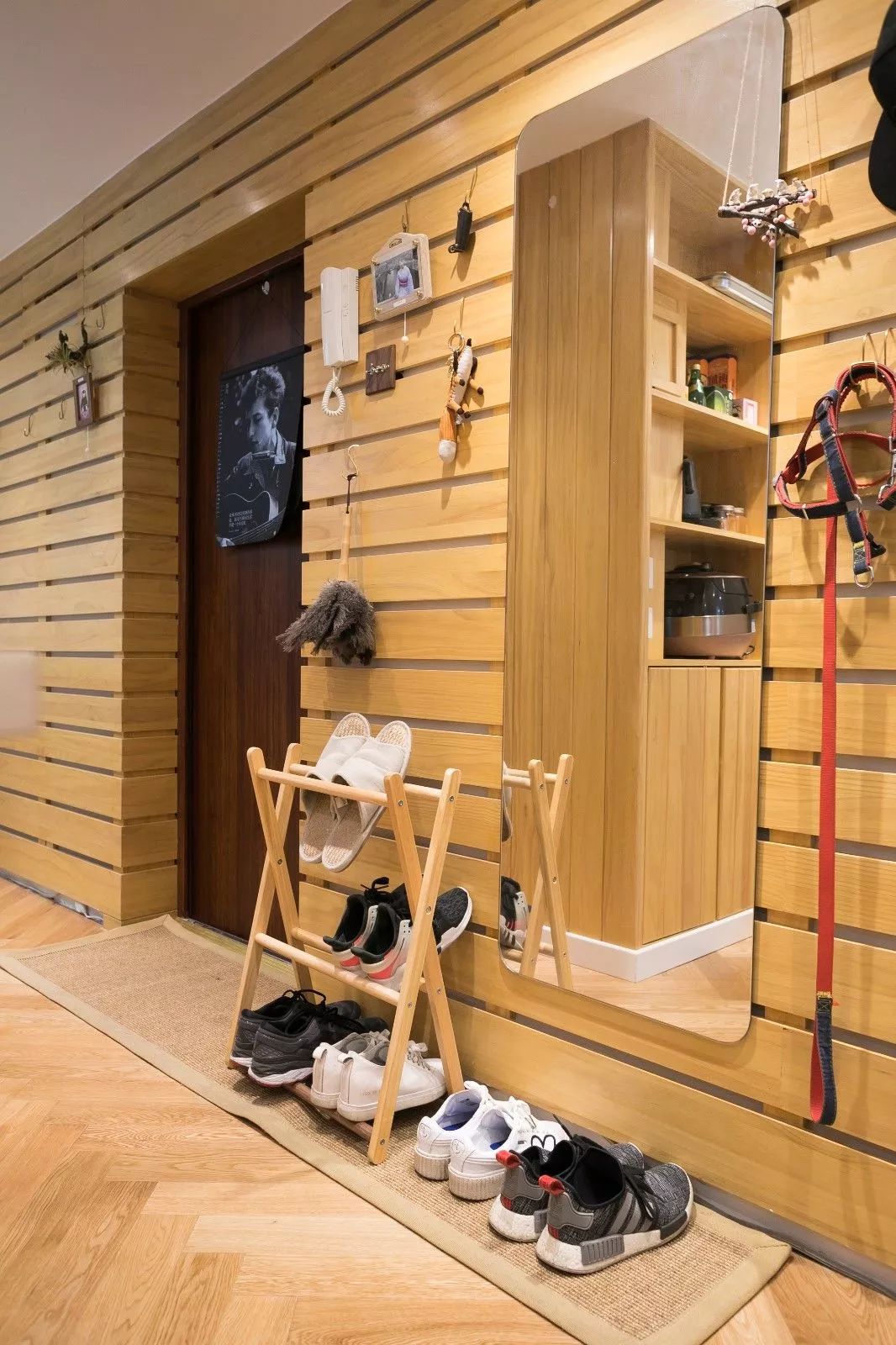 入户的玄关走廊连通了厨房和客餐厅,走廊的宽度不够,所以没有摆放鞋柜,而是由一个立式的鞋架和穿衣镜、挂钩等组成,更加轻便。