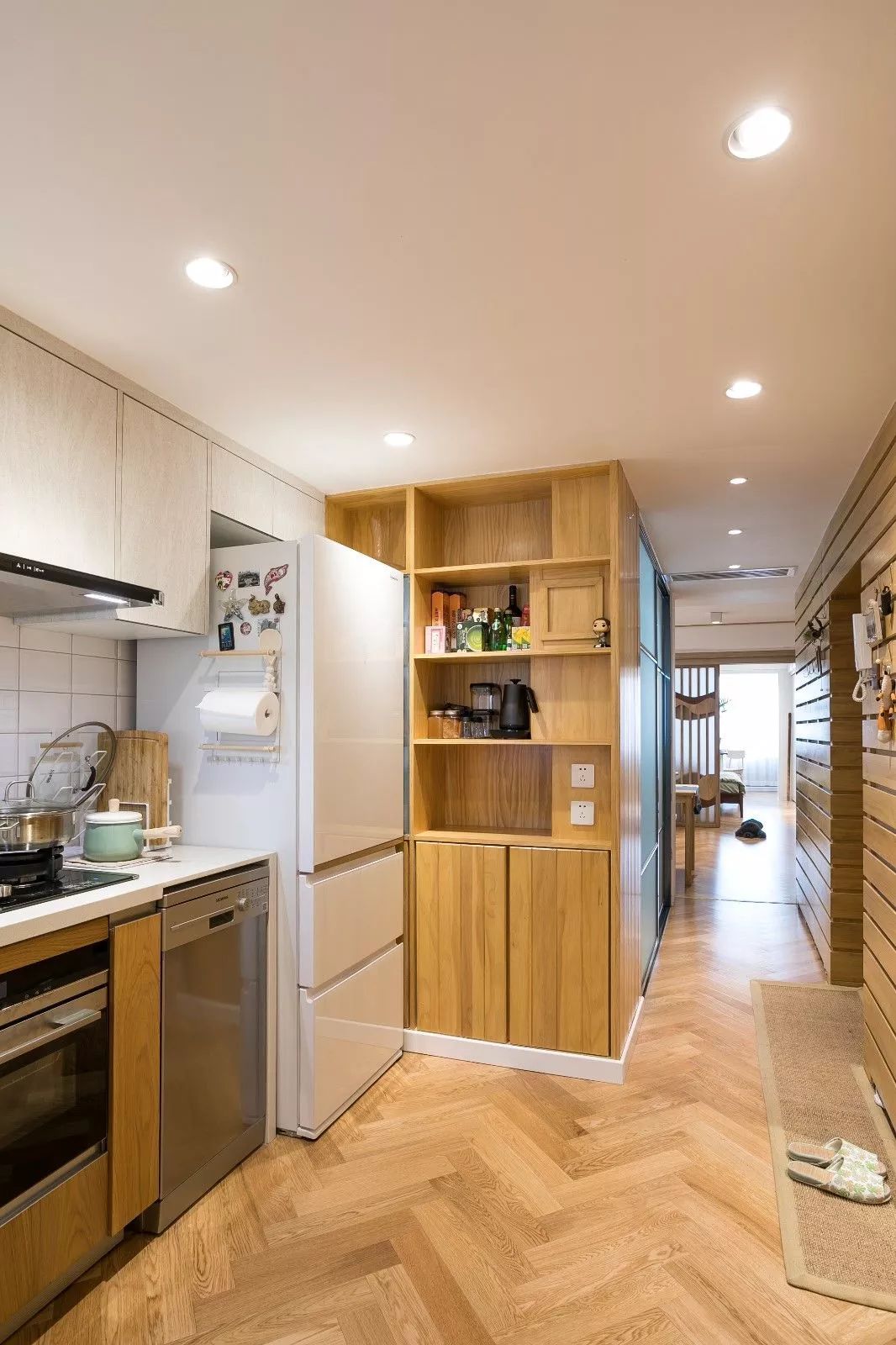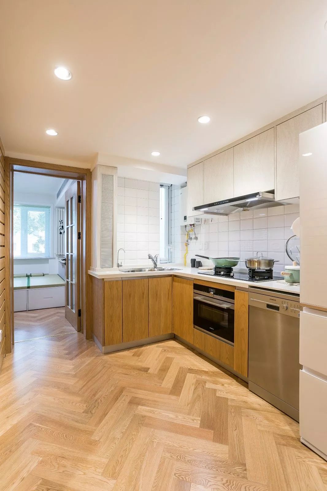 厨房就在入户门的厨房,嵌入式的柜子搭配开放式的布局,冰箱也被嵌入了橱柜和吊柜之间。地面铺贴人字拼的木地板,延伸空间视觉感。