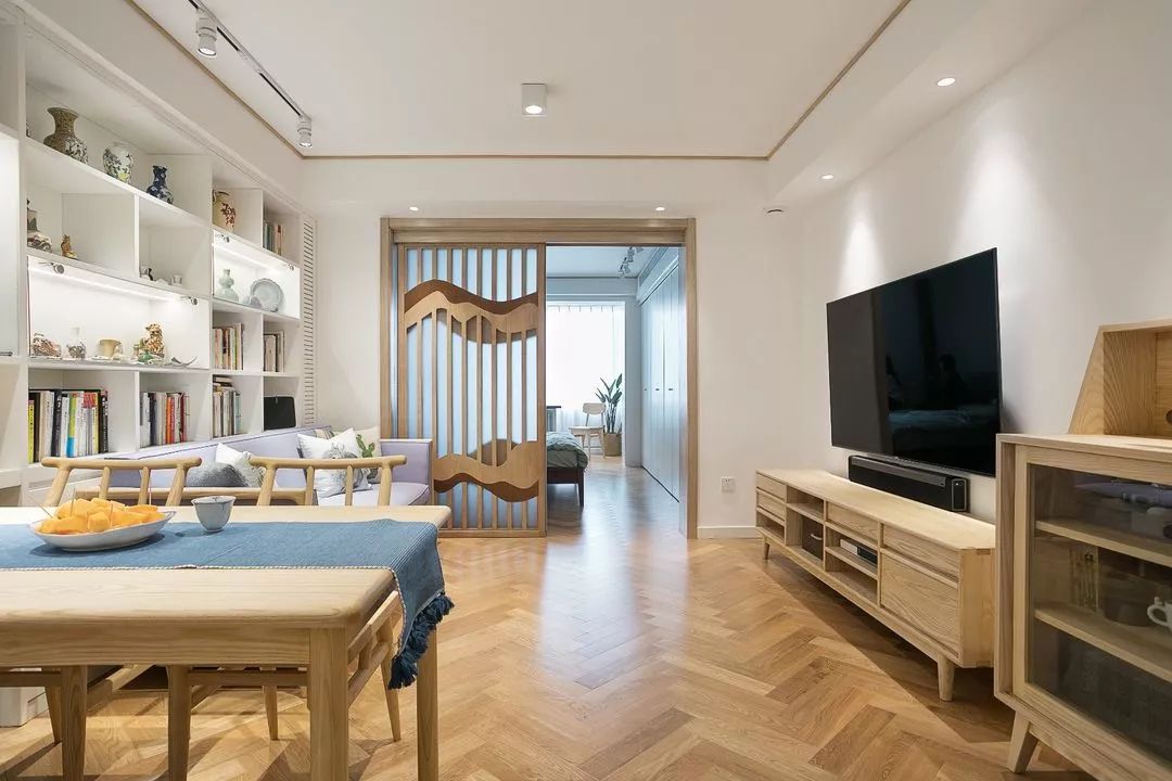 客厅也承担着通道的作用,所以把茶几也给省略了,主卧室和客厅之间用磨砂玻璃加木栅栏的推拉门作为隔断,让客厅能够借到一些光线。