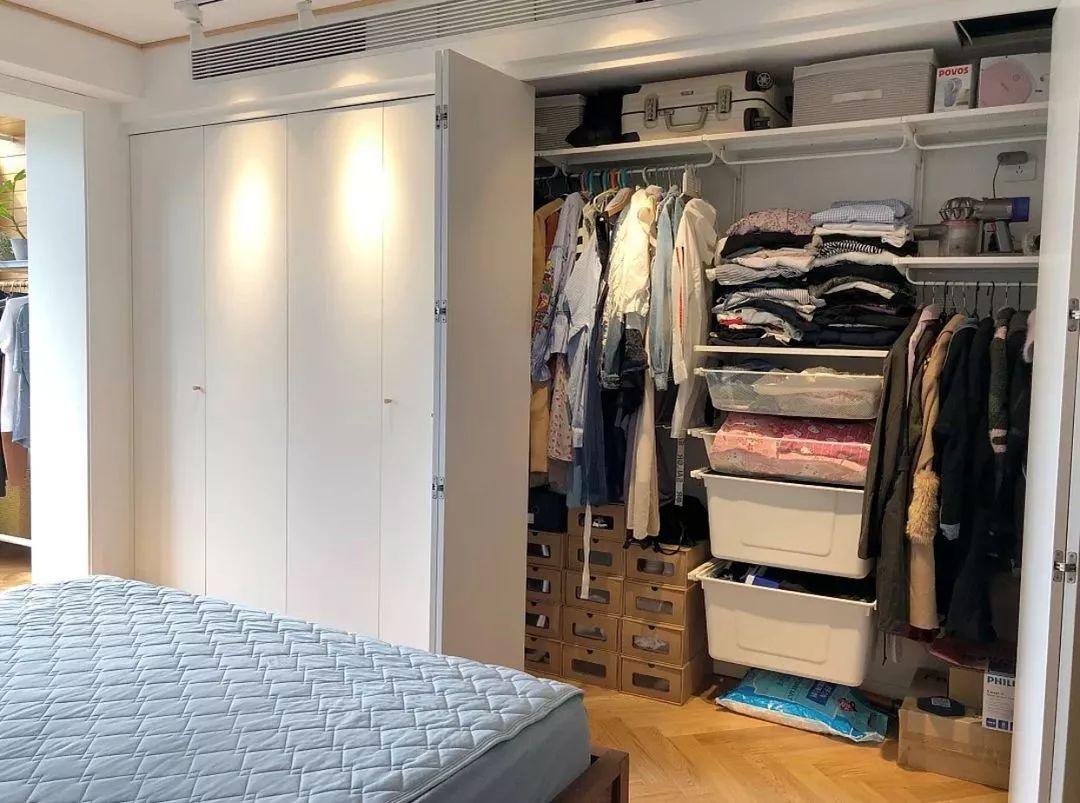 主卧室的床尾被全部利用起来改成了储物柜,衣柜的柜门选择了比较少见的折叠门,打开之后也能够给人一种衣帽间的感觉。