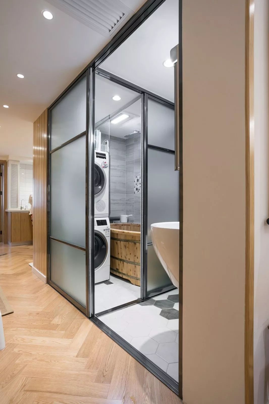 卫生间是在玄关走廊处,设计师用磨砂玻璃来隔出了卫生间空间,浴缸、洗衣机、马桶和洗手台都被分开,做了彻底的干湿分离设计。