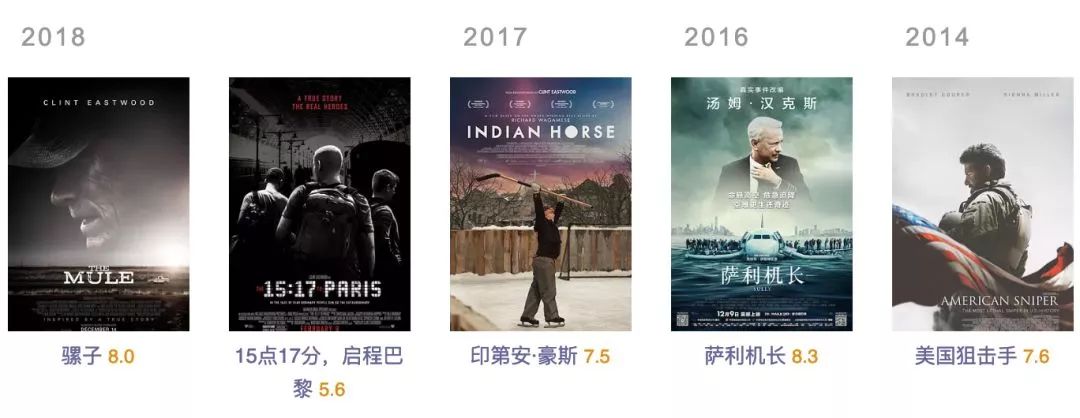 《萨利机长》、《美国狙击手》、《泽西男孩》、《胡佛》、《成事在人》、《换子疑云》、《父辈的旗帜》、《硫磺岛的战役》……