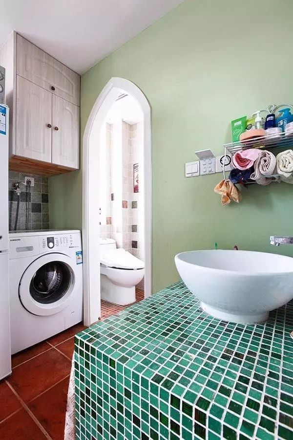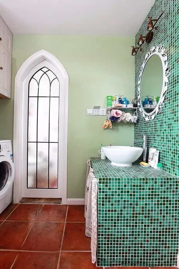 洗手台用绿色的马赛克小砖铺着,厕所的门都比一般的门小一圈