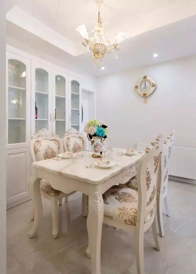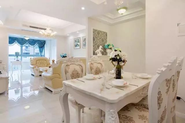 玄关进来一边是餐厅,一边是客厅,而整体色调是以白色为主,搭配欧式风的家具着实显得很有档次,并且也是很时尚又很优雅,而且还有种温馨的感觉!