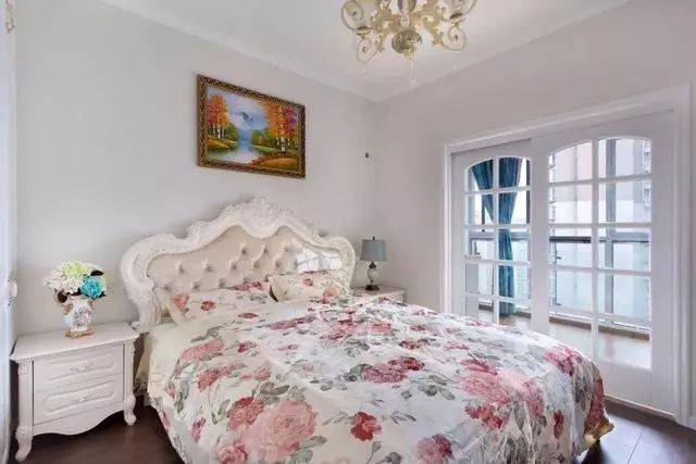 欧式床看着就高档~而且卧室还是带阳台的,并且与阳台之间的隔断门也是既好看的~