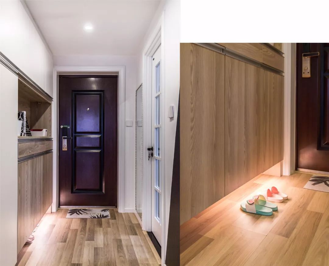 玄关的鞋柜与中部都是留空的,在底部留空的基础还在鞋柜底部装了藏光,使得底部常换的拖鞋更加方便容易找到。同时这个暖心的反光设计,也增添了玄关空间的温馨舒适感。