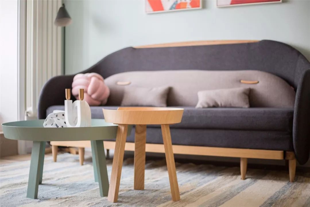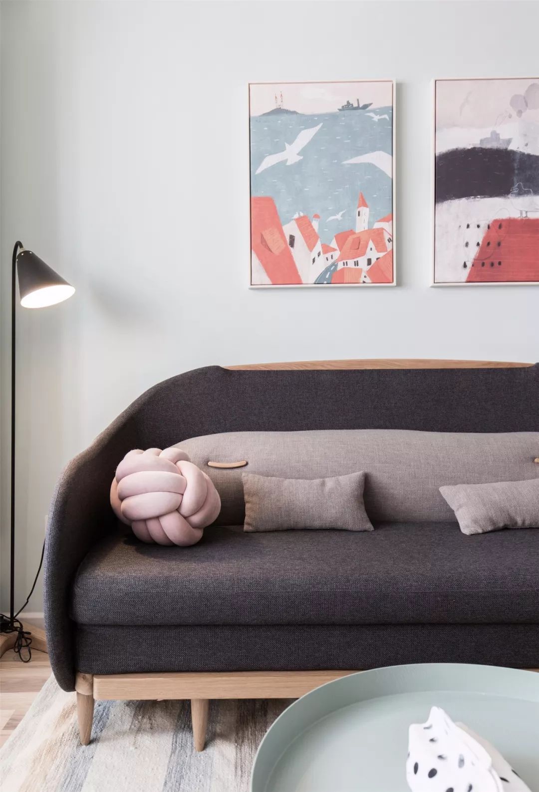 客厅紧凑的面积下以文艺小强的双拼圆形茶几,木质电视柜与圆弧边的灰色布艺沙发,淡蓝色的沙发墙上挂两幅手绘装饰画,一眼看过去满满的文艺雅致感。