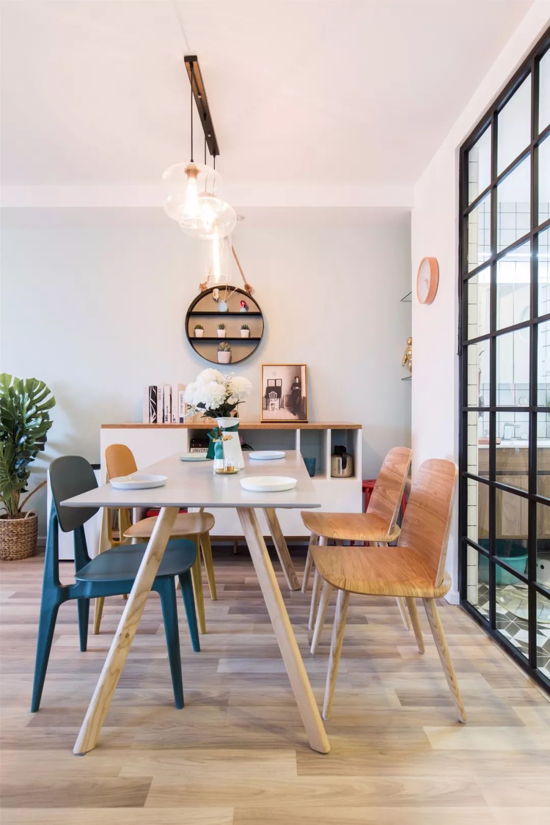 餐厅与卫生间洗手盆之间隔了一块黑色玻璃隔断,文艺简洁的餐桌椅搭配,靠墙的餐边柜布置上书籍与圆形吊架画,两盏暖调的灯具让餐厅显得惬意情趣,令人胃口打开与家人一起享受丰盛的晚宴。