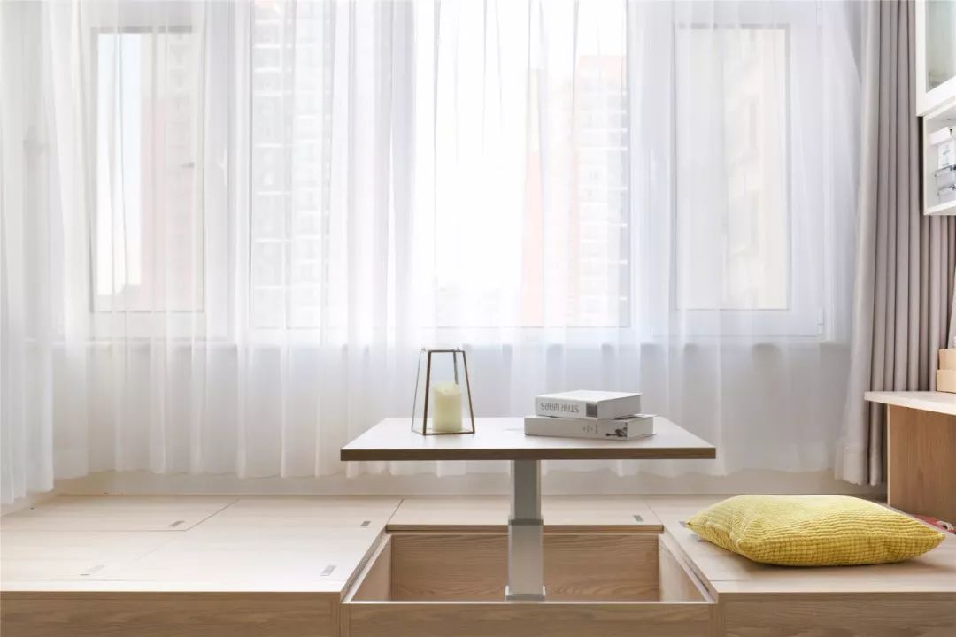 客厅旁边的阳台打通纳入,以榻榻米抬高阳台,在带来收纳储物柜的同时,中间的升降台也使得这个阳台成为一个有趣的休闲活动空间。