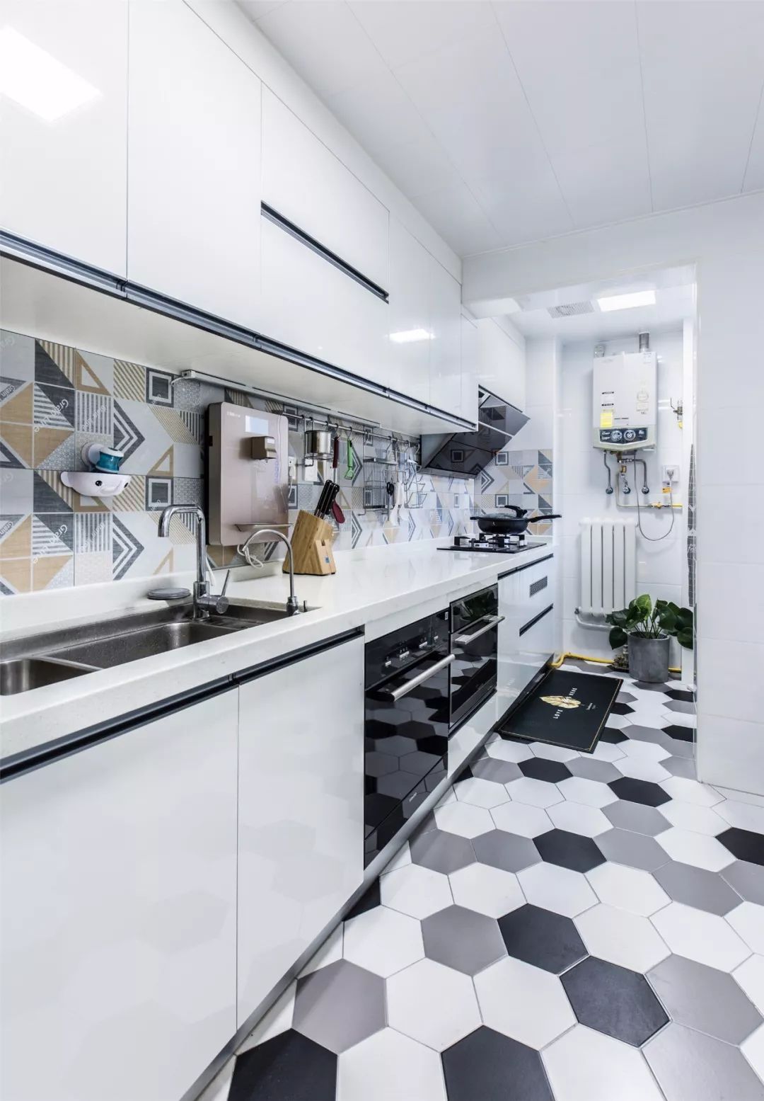 厨房在黑白灰三色六边砖地面,墙面是花砖,结合黑白配的橱柜,让烹饪空间显得文艺而有气质。