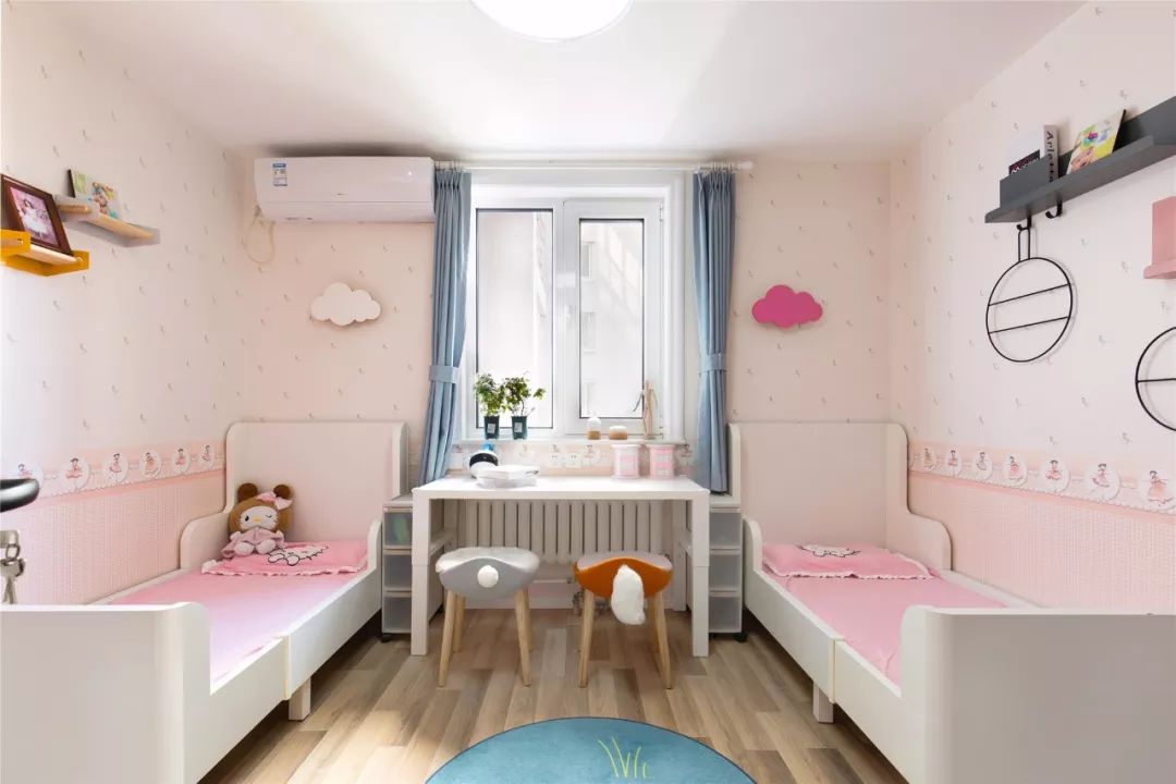 儿童房以粉色公主调基础,两侧儿童床+靠窗双人儿童书桌,中间,中间腾空摆上地毯就是孩子们的活动空间,充满了童趣的浪漫。