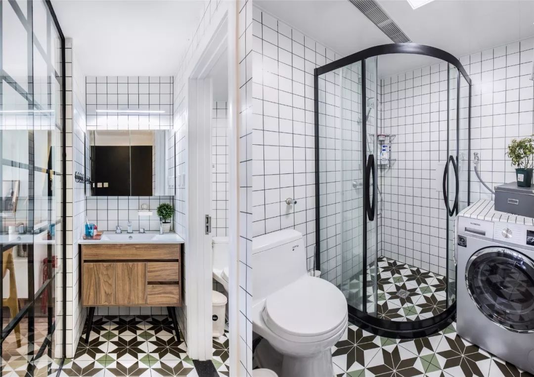卫生间花砖地面+小白在墙面,圆弧形的淋浴房是黑色框的,整体时尚简洁的黑白配,结合花砖地面显得年轻简约好自然。