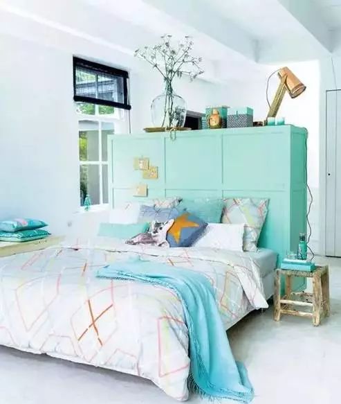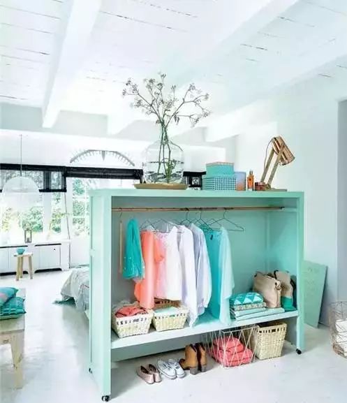 ▲实用的置物柜做隔断,不仅可以隔断还增加了收纳效果,搭配相同颜色的床上单品,整个装饰整齐统一,很适用于小户型。