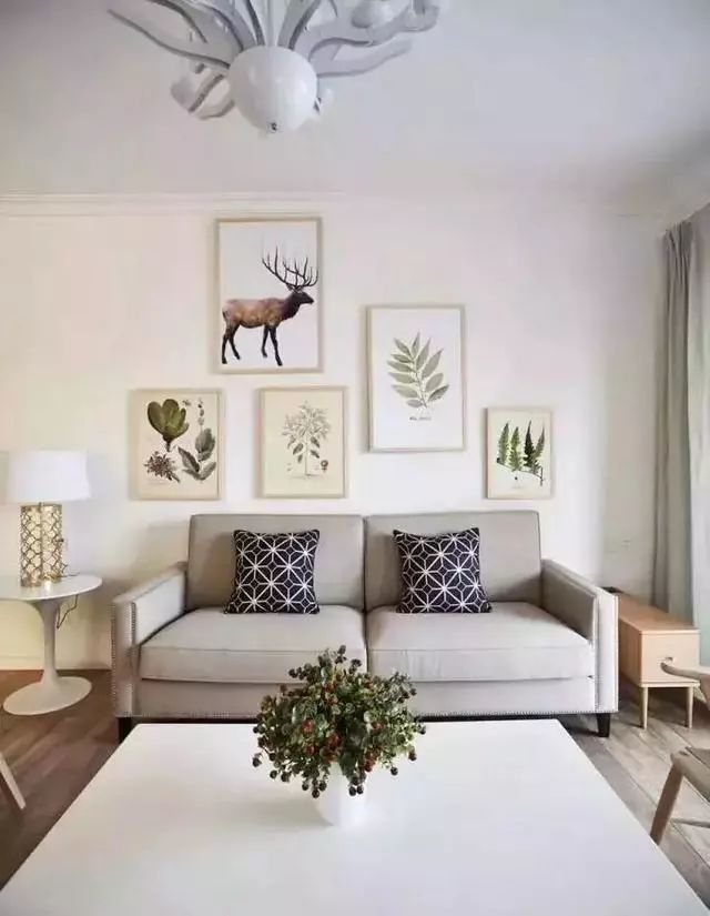 客厅墙面用乳胶漆喷白墙,不做吊顶,装修非常简单,在沙发背景墙上挂上一些装饰画,增添色彩,再结合沙发、抱枕、家具、窗帘,非常好看。