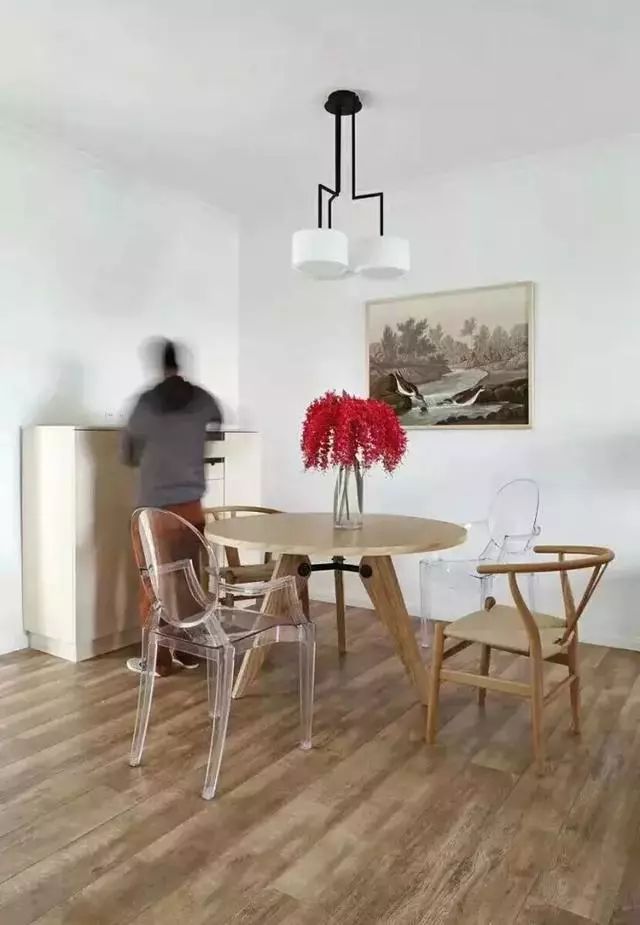 餐厅布置很简单,摆放了一张圆桌,4张凳子,其中两张透明凳子很吸引眼球。
