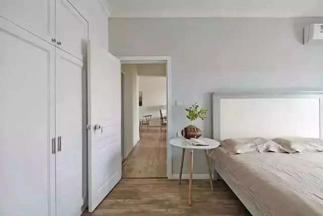 卧室主要的家具有衣柜、床铺和凳子,床头柜都省了,只摆放了一张小桌子。