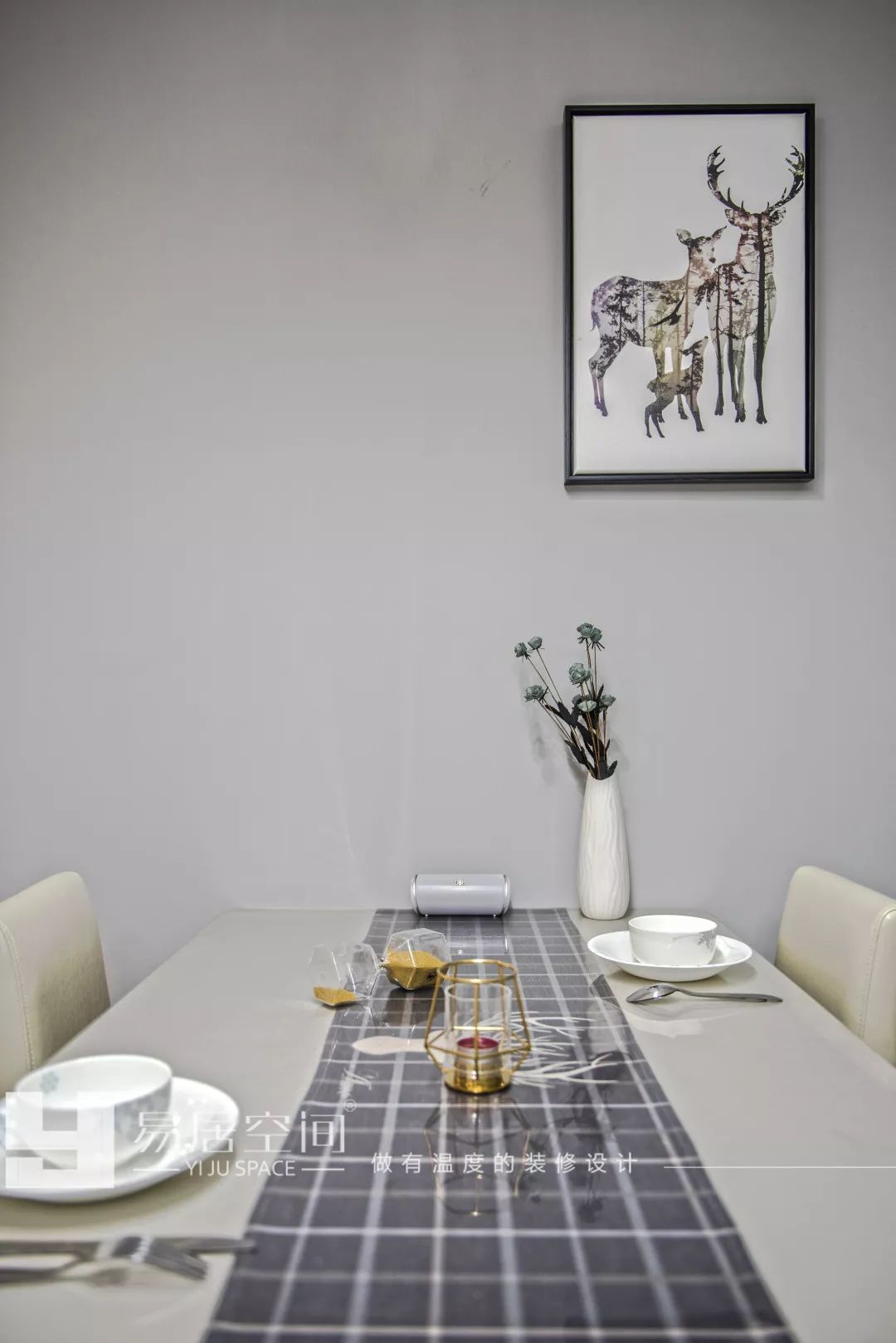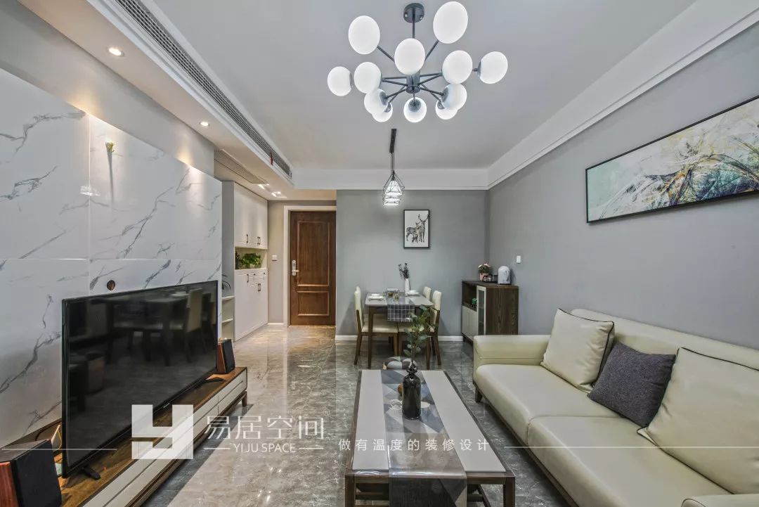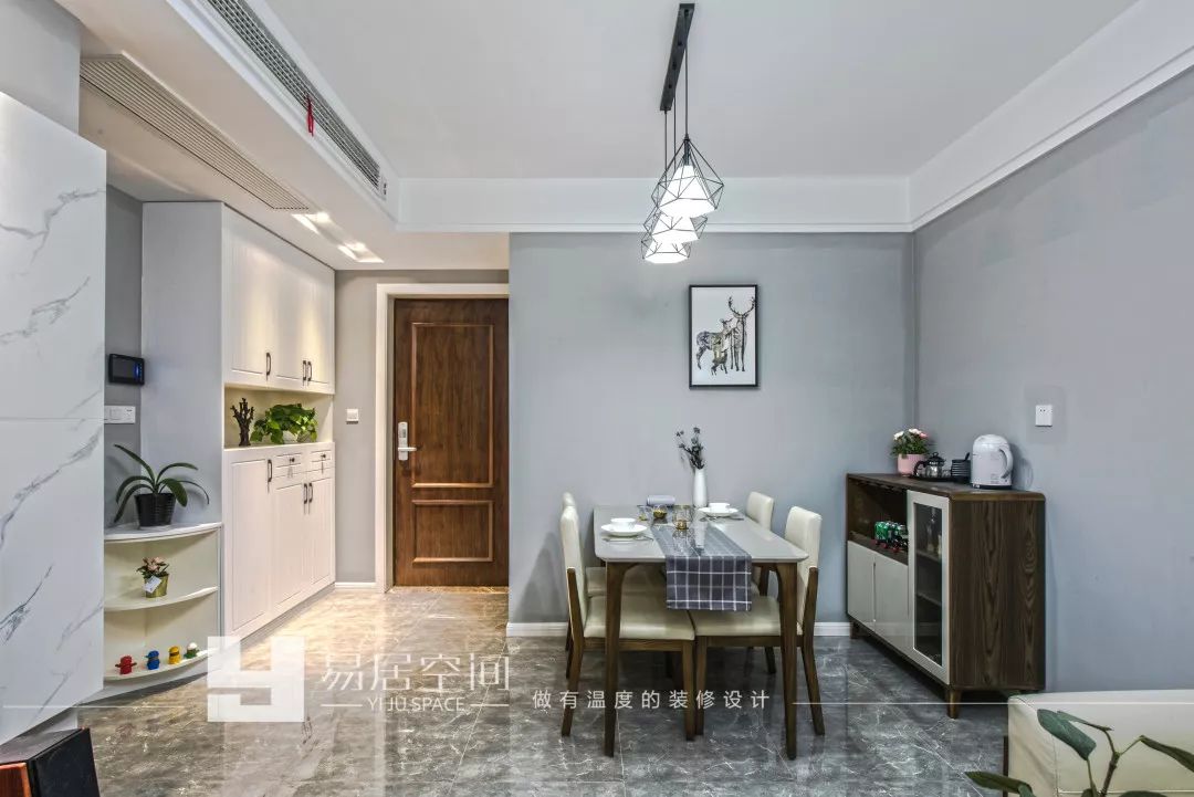 客、餐厅的背景墙面与地面采用统一材质,在视觉效果上成为一个整体。餐桌和餐边柜与茶几是配套的,在灰色的地砖、白色吊顶衬托下,显得更加稳重。