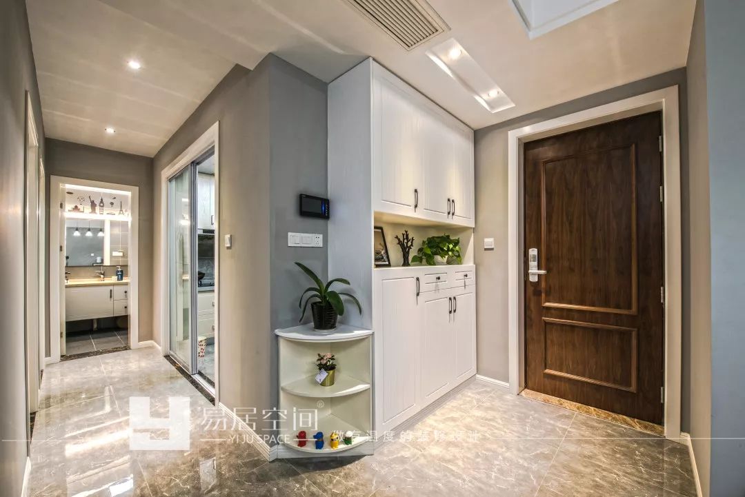 进门是现场定制的鞋柜,顶天立地的设计让空间最大化的利用,因为开关位置的原因,设计一转角矮柜,摆放一些小装饰品。