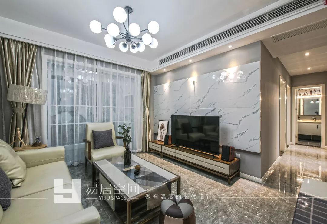 电视背景墙采用80*80的自然纹理大理石瓷砖无缝拼接,采用不锈钢金属条收边。为了吊顶的视觉效果,设计师特意让工人把中央空调的出风口延长。