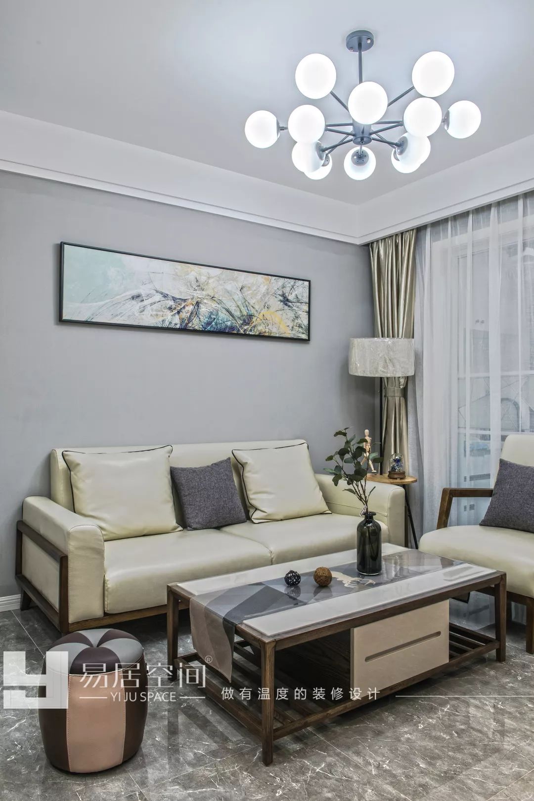 软装的搭配上:灰色乳胶漆墙面、哑光皮质沙发、白咖色搭配胡桃木色配套茶几及电视柜,让整个空间看起来沉静平衡。