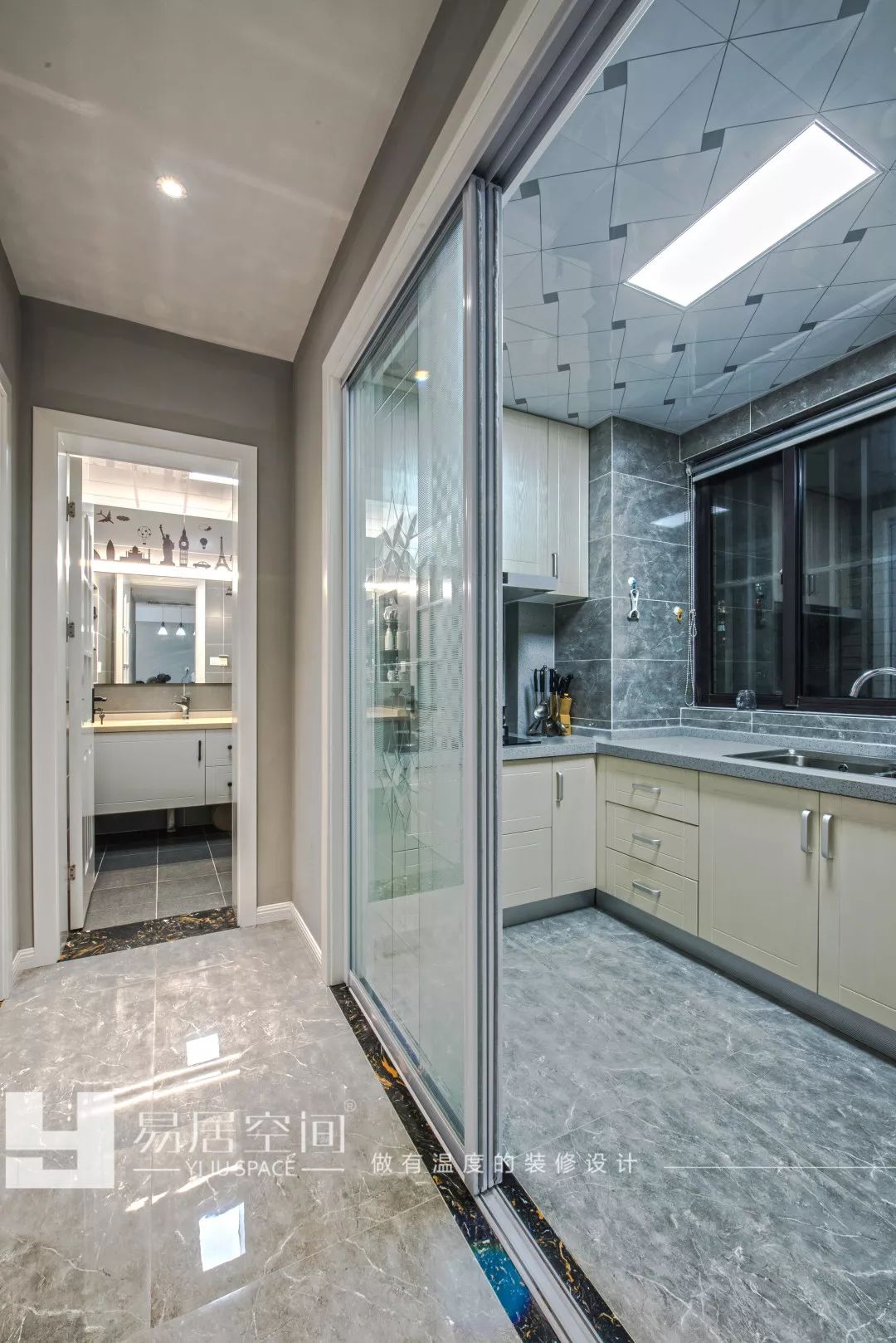 厨房采用灰色系柔光玻化砖及灰色石英石台面。简约干练,整体配色都传达出一种现代化的生活理念。