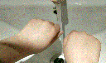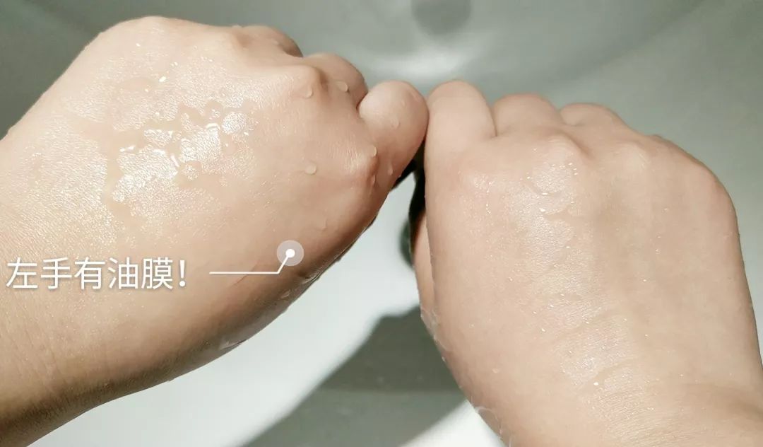 可以看到左手上有一层很明显的油膜,冲洗后,用另一只手感受一下,油膜感还在!