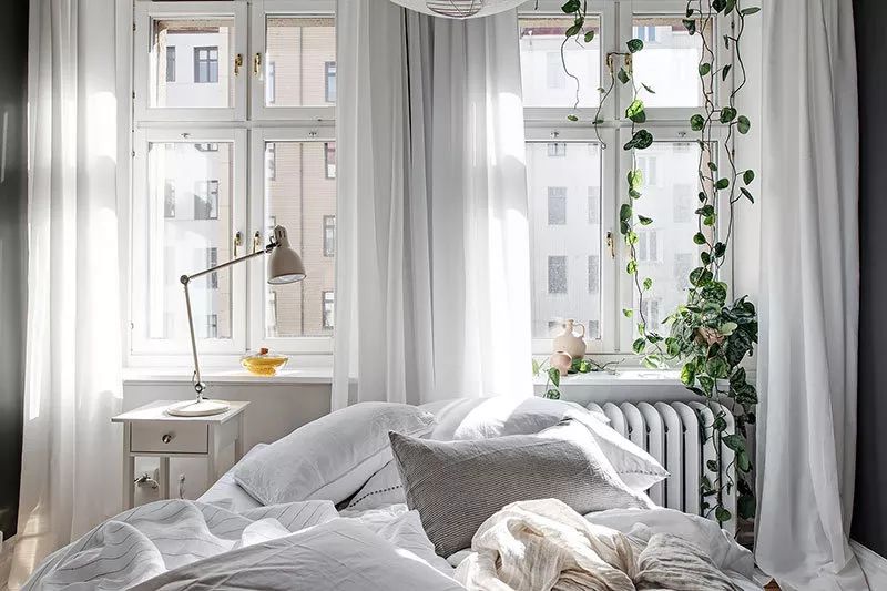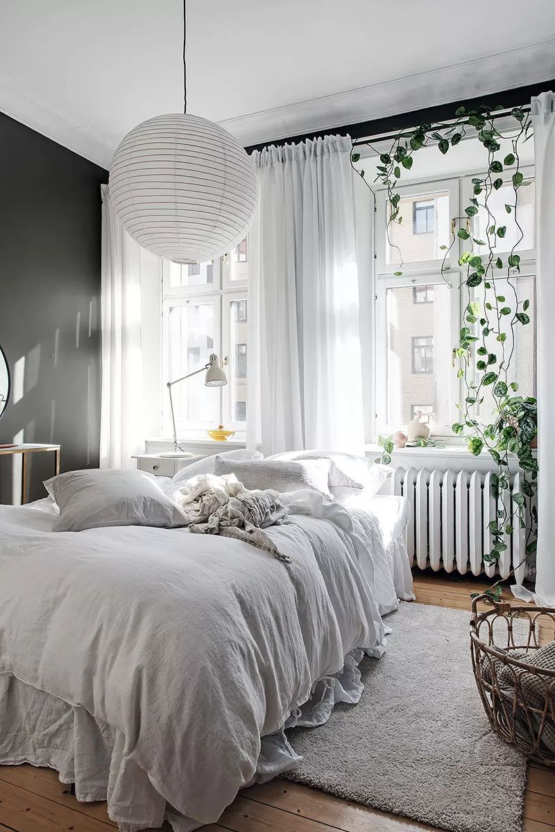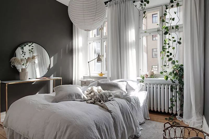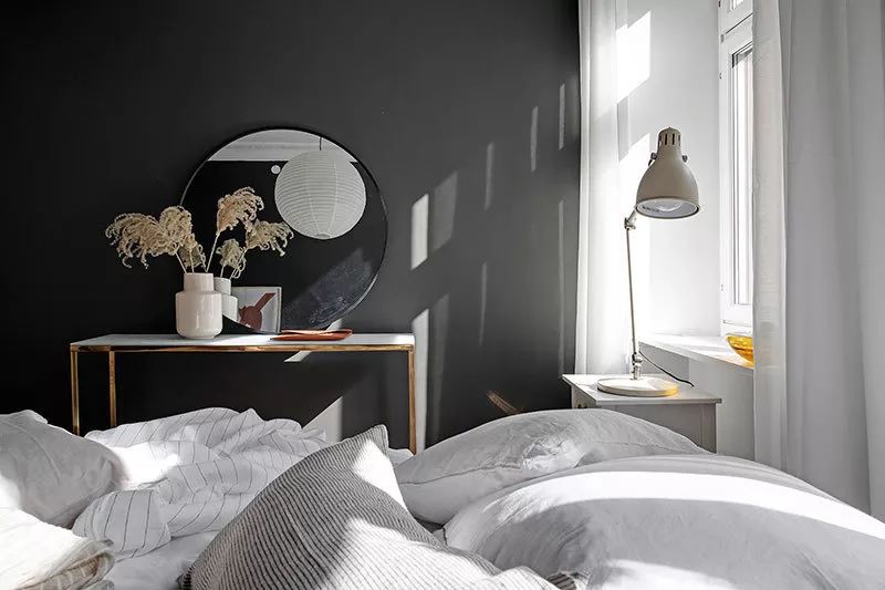 砖墙为白色斯堪的纳维亚内饰增添了很酷的特征,没有一丝阁楼风格。卧室尽可能小,只有一张床,一张桌子和一面镜子的家具和时尚的深色墙壁。