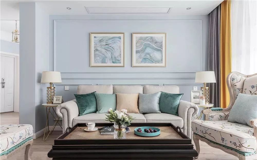 ▲客厅墙面选择将蓝绿色色彩纯度降低,明度中度,家具配以各类同色系软装丰富空间色彩层次。