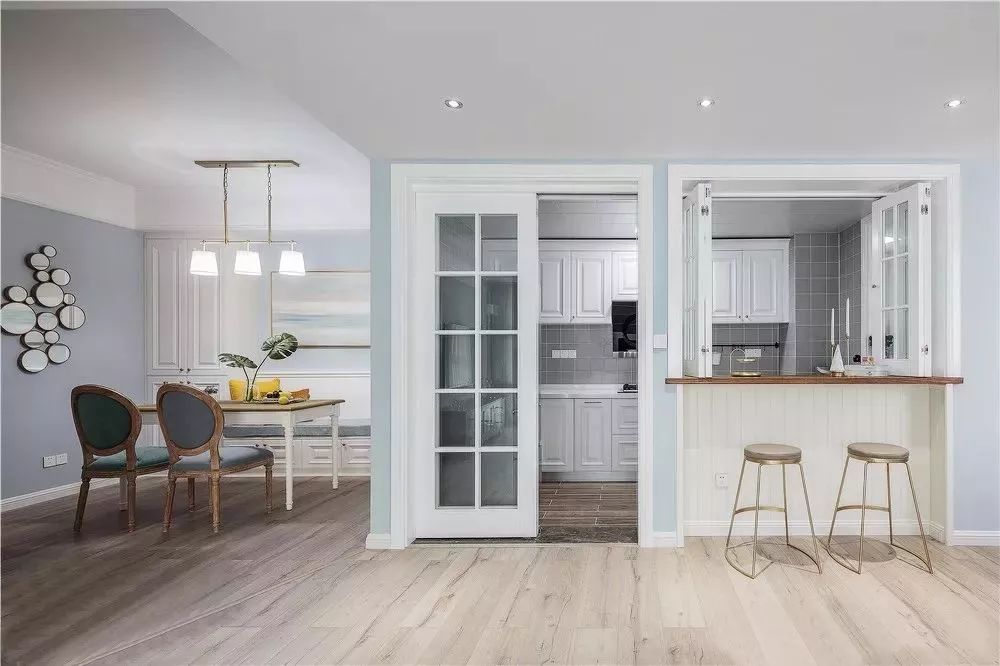 ▲玻璃推拉门和玻璃折叠窗的设计保证了空间的相对独立,又增添了厨房和客厅之间的联系互动。既增加了趣味性,也开阔了厨房视野。