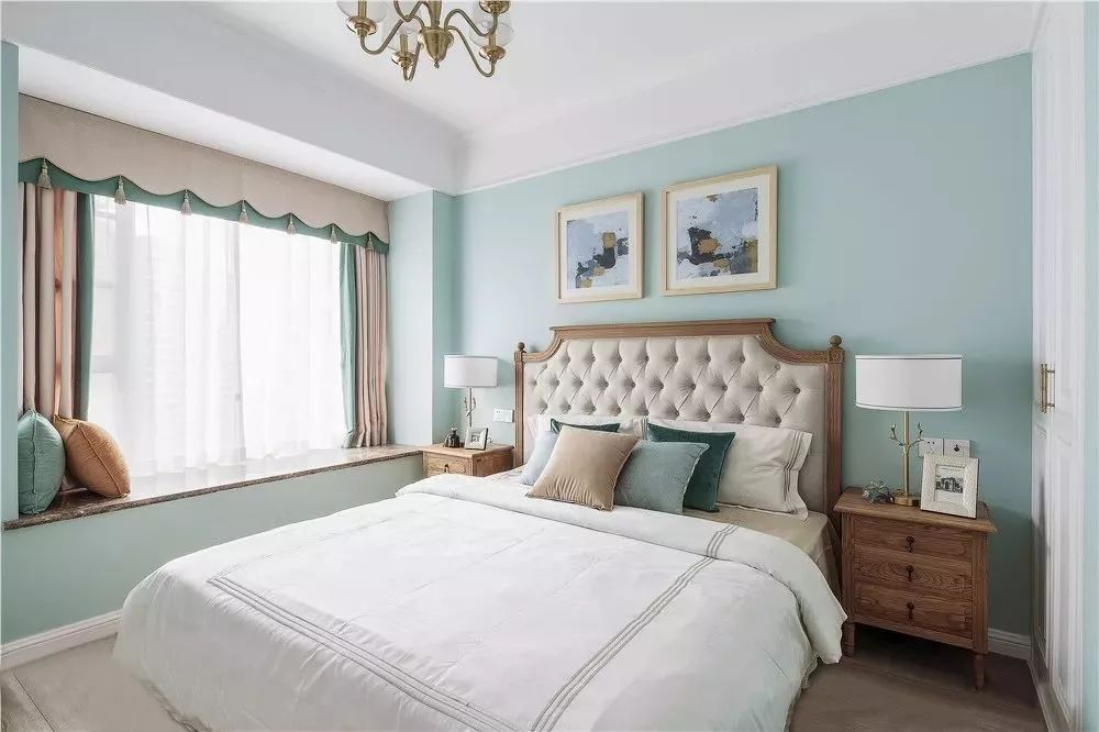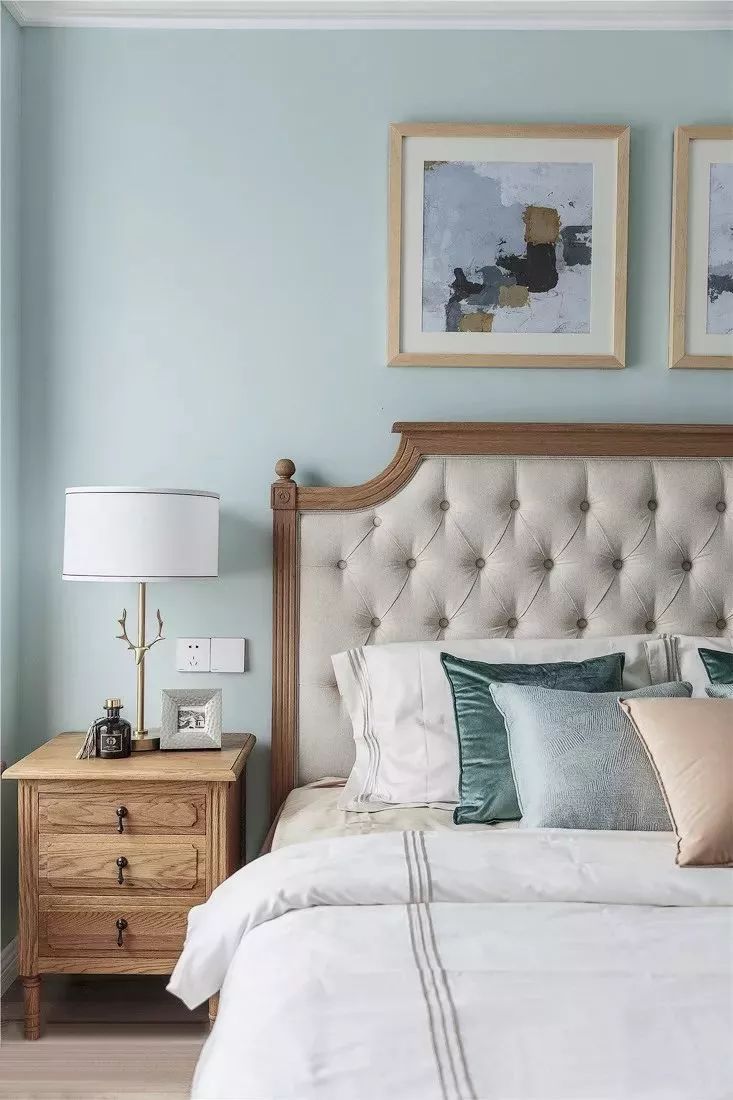 ▲主卧选用原木色家具平衡蓝绿色墙壁的明度,软包床头符合人体贴合舒适度,整体营造安逸自在的睡眠氛围。
