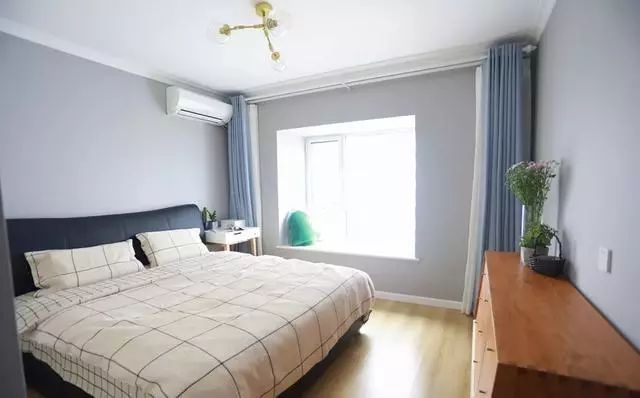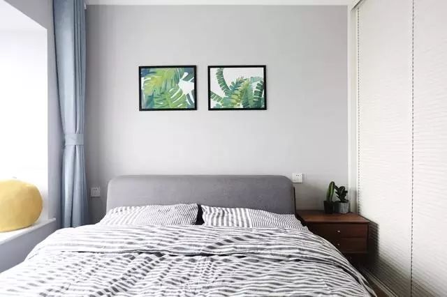 次卧不大,装修简洁舒适很喜欢。飘窗不让整改,不然就换成柜子,增加收纳了。背景墙利用植物画装饰,绿色做点缀缓解空间单一感。