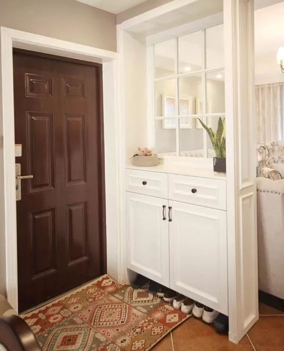玄关,其实我家最初是没有独立的玄关的,一进屋的左边就是餐厅,右边就是客厅,没有玄关就意味着没有鞋柜,所以我们坚持一进屋设这个隔断,设计方面在网上也是参考了不少隔断的模板,最终折中考虑,我们把下半部分做了鞋柜,上半部分做成白色框架的玻璃隔断,这样一来保证了储物又保证了美观通透。