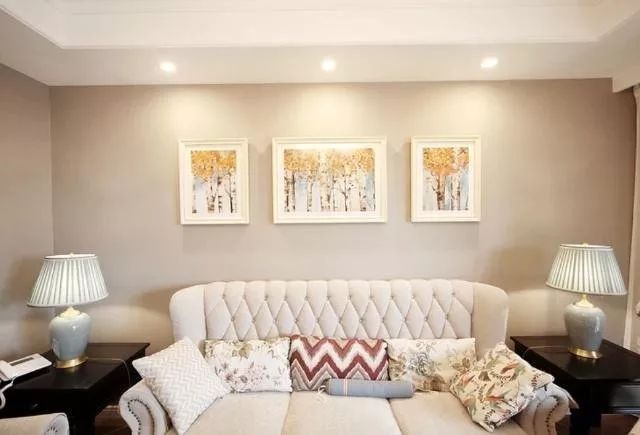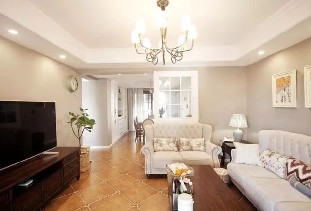 那么隔断的背后就是我家的客厅了,不得不说简美风的装修效果真心很耐看,灰色乳胶漆涂刷的墙面,在暖色灯光的烘托下格外温馨,配上地面斜铺的美式复古瓷砖,电视墙即便不做任何装饰也很大气耐看,家就是这样温馨明亮才好。