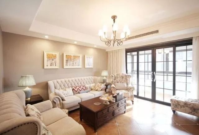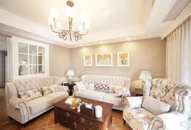 因为有了隔断的存在所以客厅可以任性的买三个组合沙发,简美风的沙发造型大气,米色的基础色调,搭配一个小碎花单椅的设计也很耐看沉稳。