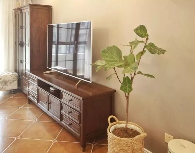 像我家的客厅家具,木制品,比如电视柜、斗柜、茶几和边几,买的都是比较经典的美式胡桃木风的,适当的深色也可以让客厅的色调更稳重,更耐看有质感。适当厚重的木色,搭配小绿植无疑也是一种自然温馨的感觉。