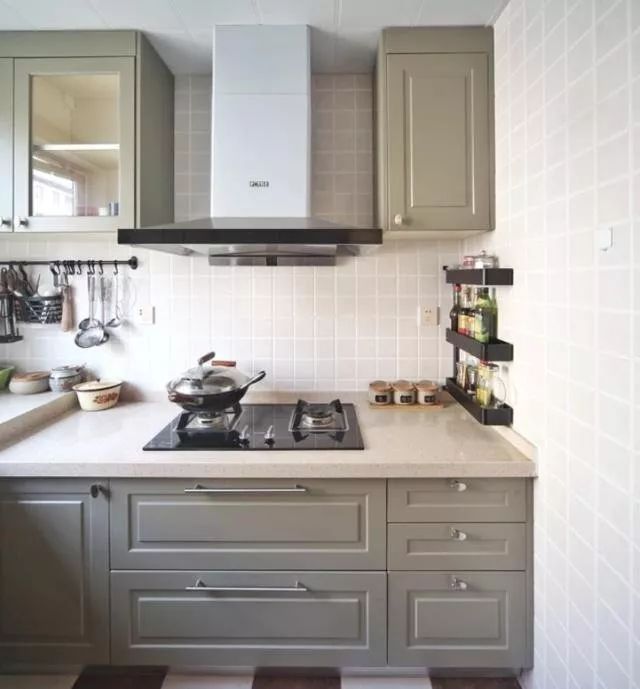 而炒菜区这边低一些,是因为本来锅放上去以后就会抬高操作位置,所以就不用担心弯腰的问题。这样做就比较符合设计中的人机工程学,我们都是和网友学习到的,很实用。橱柜我们是定制的,门板适当的带了些造型,灰色的很耐看。台面石米黄色的石英石台面,耐用结实性价比高。
