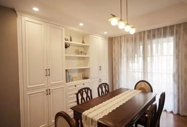 餐厅我个人建议如果有足够的空间,还是多装一些柜子比较好,在设计的时候可以选择像我家这种中间镂空做一些造型,这样就不至于呆板。房子入住收纳肯定是越来越不够用的,所以多准备一些柜子准没错。简约的小吊灯,搭配实木的餐桌椅,经典耐看,整个餐厅被烘托的十分温馨。