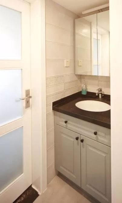 我家的公卫确实太小了,所以在公卫的外面,一点点的空间定制了一个洗手台,这样不仅可以保证内部的空间足够,一家人用起来的时候也不会抢厕所。