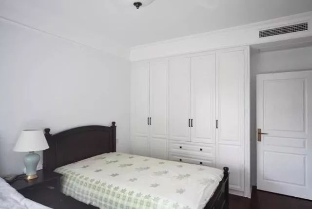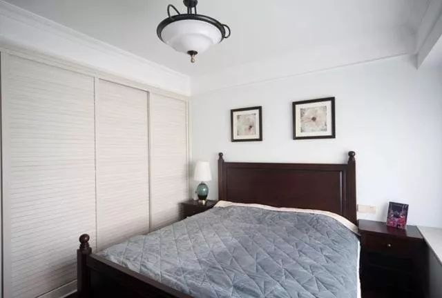 白色百叶门的推拉大衣柜,耐看简约。墙面是浅蓝色的乳胶漆涂刷,搭配实木深色的大床和床头柜,不做吊顶也很大气。睡觉的空间,耐看温馨就好,不需要太多浮躁的装饰。