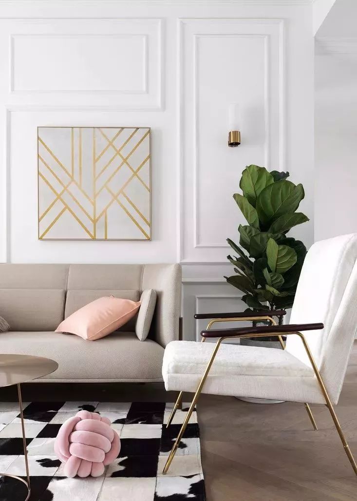 客厅墙面白漆为底,线条为辅,即使是墙上的挂画,也是以金色线条为装饰。