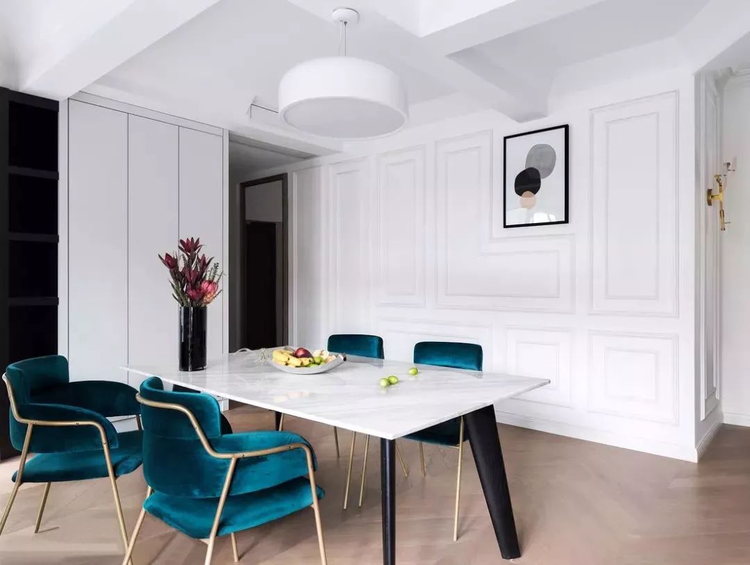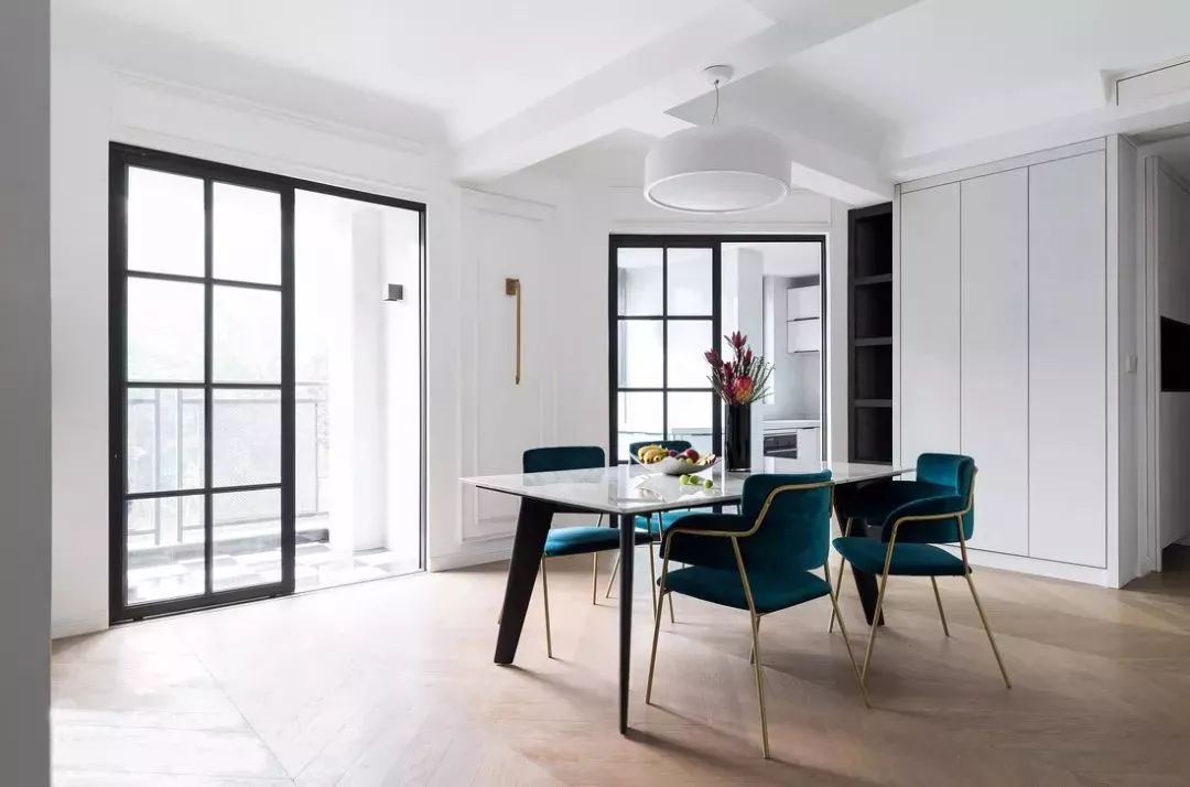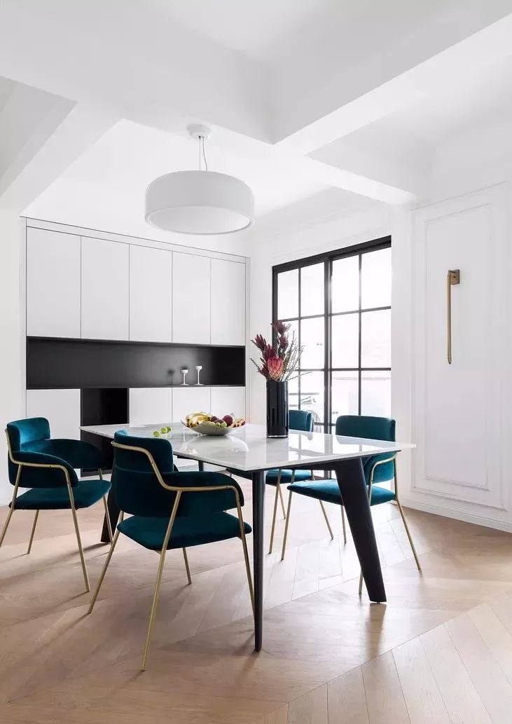 餐厅大面积留白,并运用直角线条,美感不需要过多的堆砌与重复,餐桌餐椅简单搭配即是一道风景。